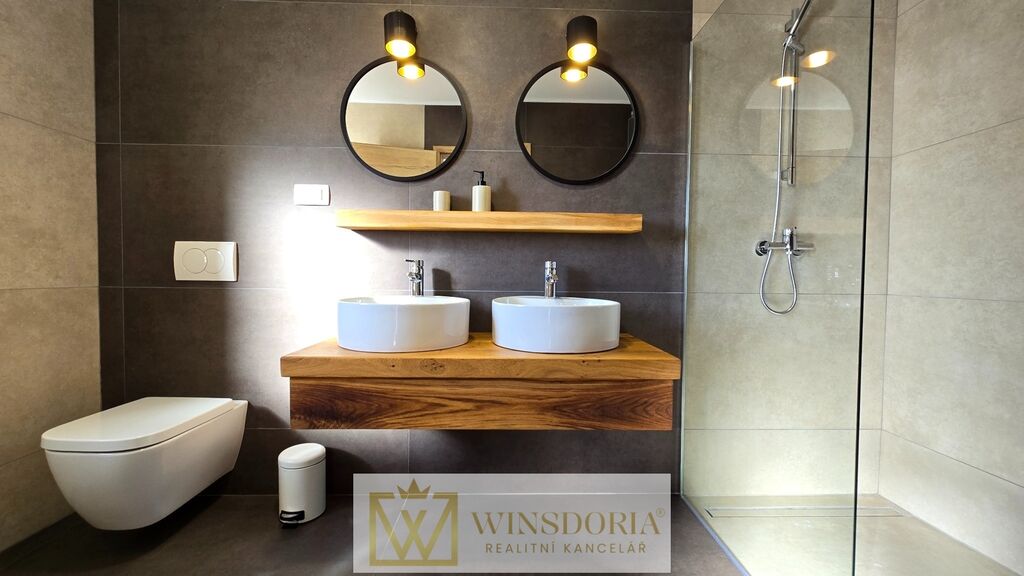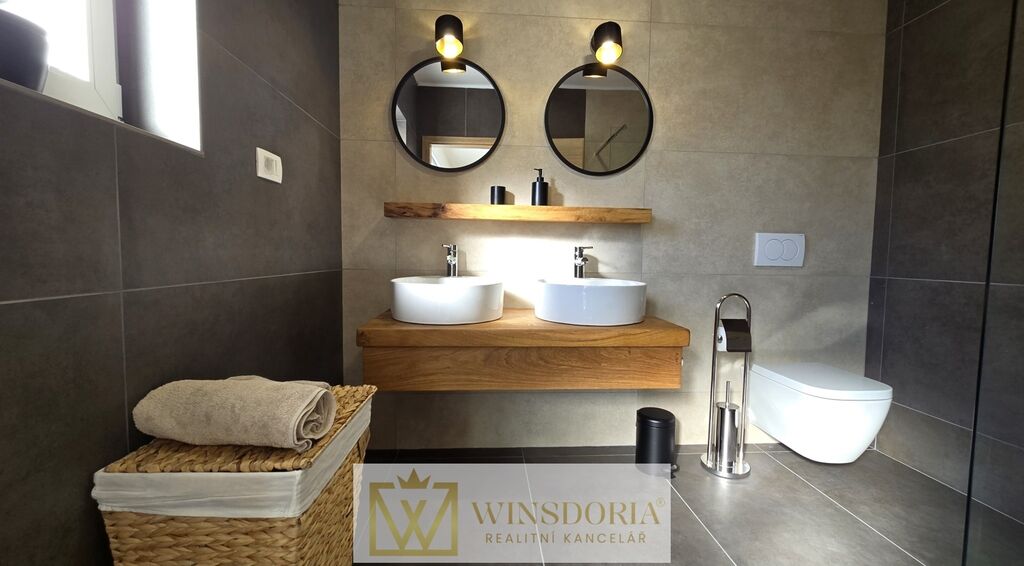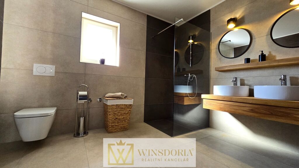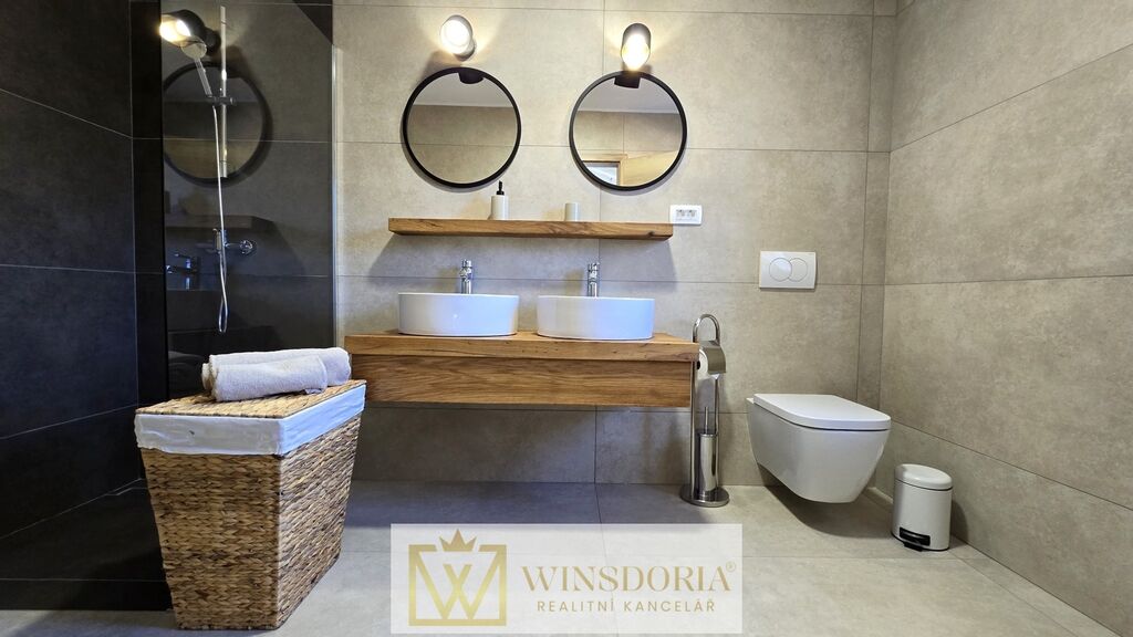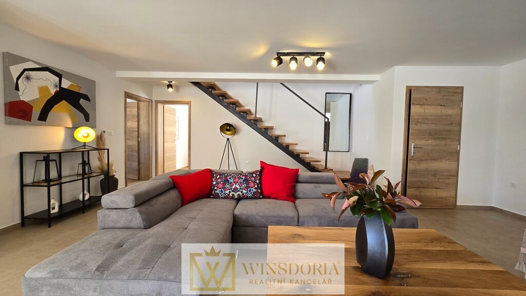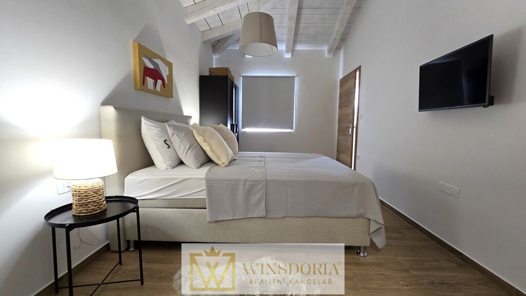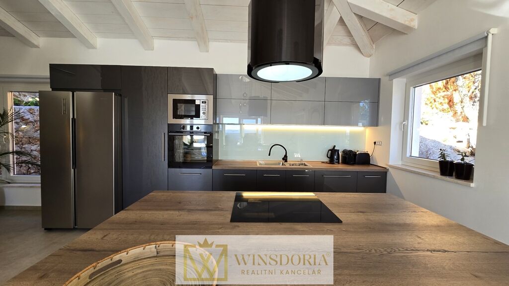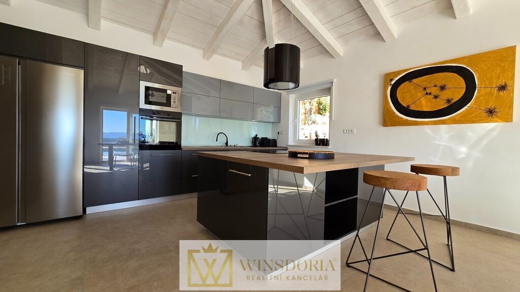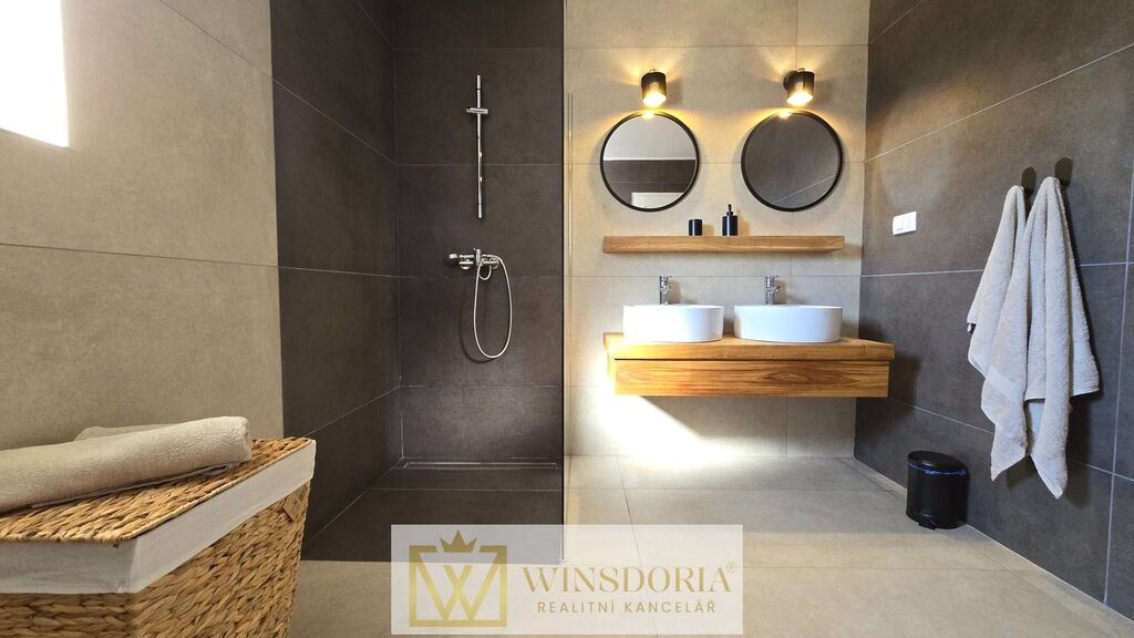 Celý interiér je klimatizován, vybaven tepelným čerpadlem s podlahovým vytápěním a stylovým krbem pro příjemné večery.