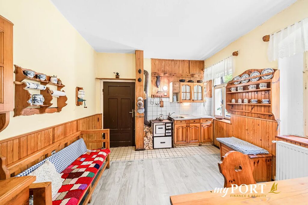 • kuchyně s jednoduchou dřevěnou linkou, kamny, stolem a skříněmi