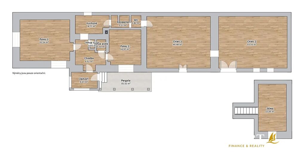 • Sklepní prostory: Nemovitost je částečně podsklepena tzv. mokrým sklepem ideálním například pro uskladnění potravin.
