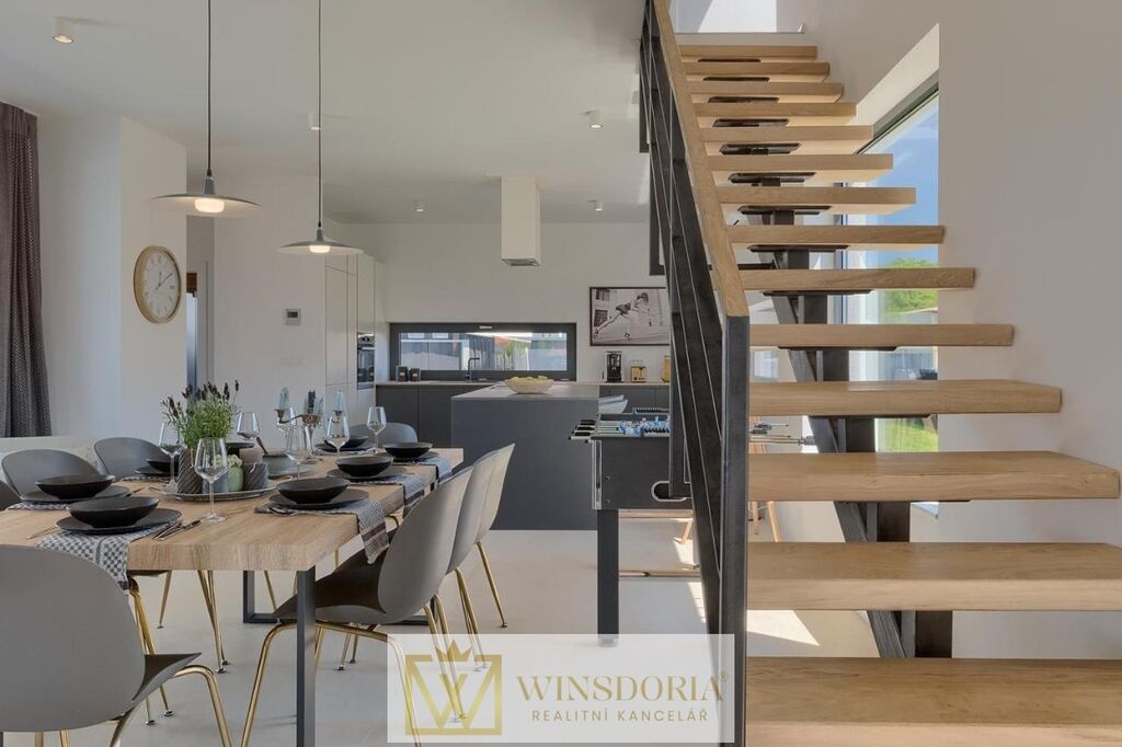 Přízemí tvoří otevřený obytný prostor s obývacím pokojem, jídelnou a kuchyní s přímým vstupem na terasu. Na tomto podlaží se nachází také koupelna.