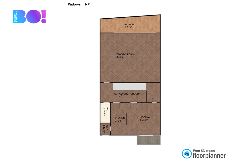 • 2. NP (společenská část): Prostorný obývací pokoj s krbem a vstupem na balkón,