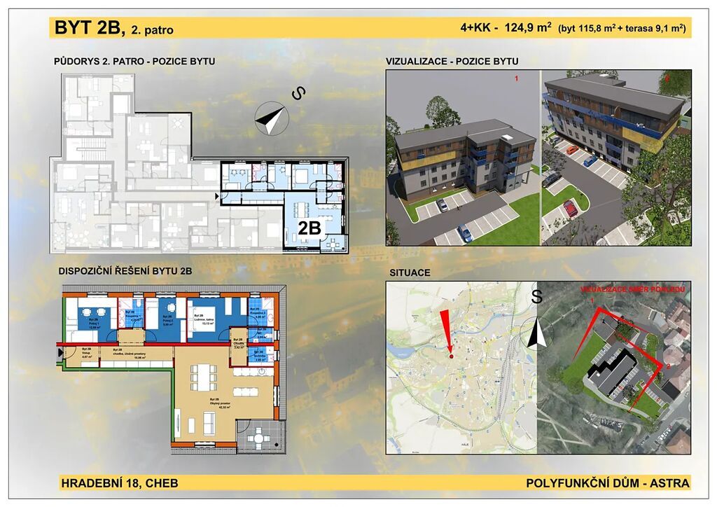Nabízíme k prodeji byt 4+kk v atraktivní lokalitě Chebu, v ulici Hradební. Jedná se o bydlení v oblíbené lokalitě Chebu v polyfunkčním bytovém domě Astra. Byt je v osobním vlastnictví. Byt se nachází ve 2. patře s osobním výtahem o velikosti 115,8 m2 a disponuje terasou o výměře 9,1 m². Okna a balkonové dveře jsou s izolačními trojskly. Je možnost dokoupení parkovacího stání v blízkosti domu. V místě je kompletní občanská vybavenost. Tento bytový dům navazuje na volnočasový areál „Krajinka“. PENB třída B – 77,3 kWh/(m2*rok)