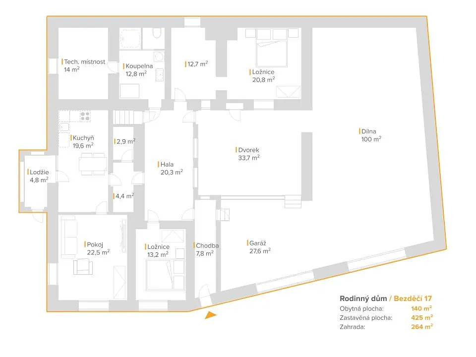 Dispozice domu sestává ze vstupní chodby s halou, ze které je poté vstup do dalších pokojů, kuchyně, koupelny, dílny a dvorku. Z kuchyně se přes zasklenou lodžii dostanete na zahradu. Dvorek situovaný v prostředku domu nabízí možnosti relaxace u kávy, grilování a odpočinku.