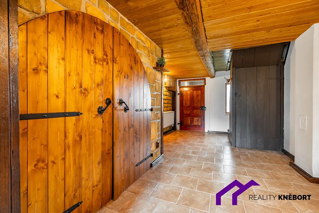 Po dřevěném schodišti se dostaneme do prvního patra, kde se nachází dvě místnosti. Kompletně zrekonstruovaná ložnice a další pokoj, který je před rekonstrukcí. Nad prvním patrem je velký půdní prostor.