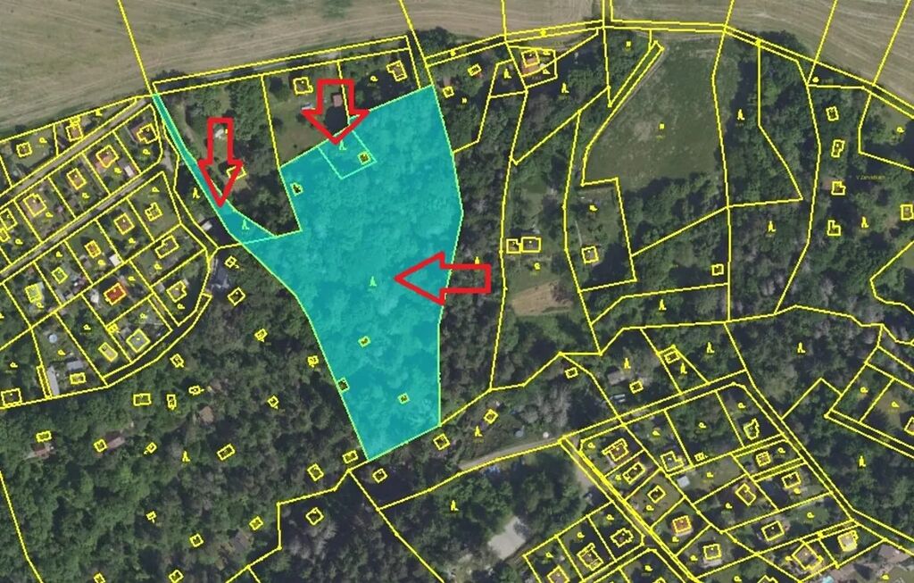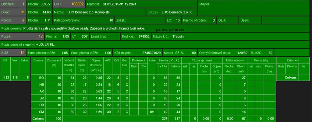 - p.č. 412/1 o celkové výměře 10 399 m2 vedená jako lesní pozemek (stáří lesa let 126 - zastoupení dřevin je borovice, habr, akát, buk, dub, smrk)
