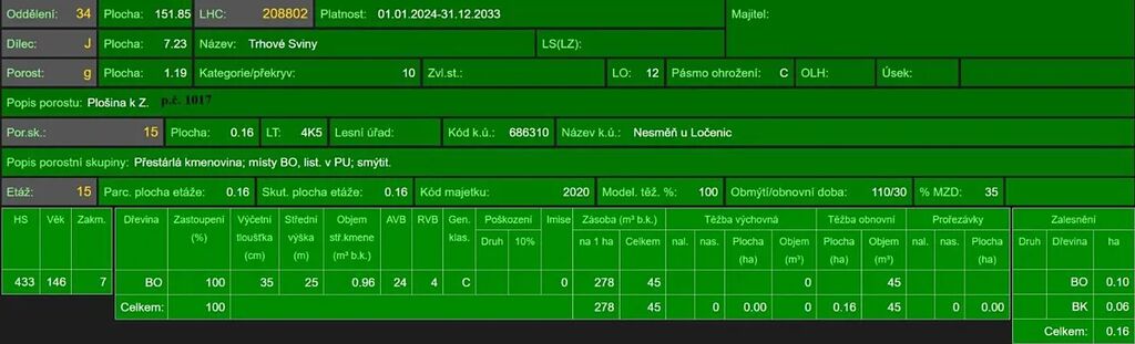 - p.č. 1017 vedená jako lesní pozemek o výměře 11 790 m2 (stáří lesa 147 let - zastoupení dřevin borovice, stáří lesa 53 a 37 let - zastoupení dřevin smrk, borovice, buk, jedle)