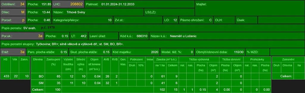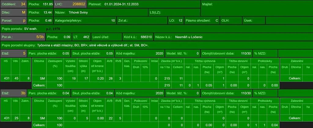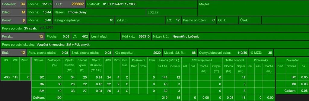 - p.č. 1970 vedená jako lesní pozemek o výměře 4 624 m2 (stáří lesa 116 let - zastoupení dřevin borovice, bříza, smrk, stáří lesa 46, 39, 26 a 23 let - zastoupení dřevin borovice, smrk).