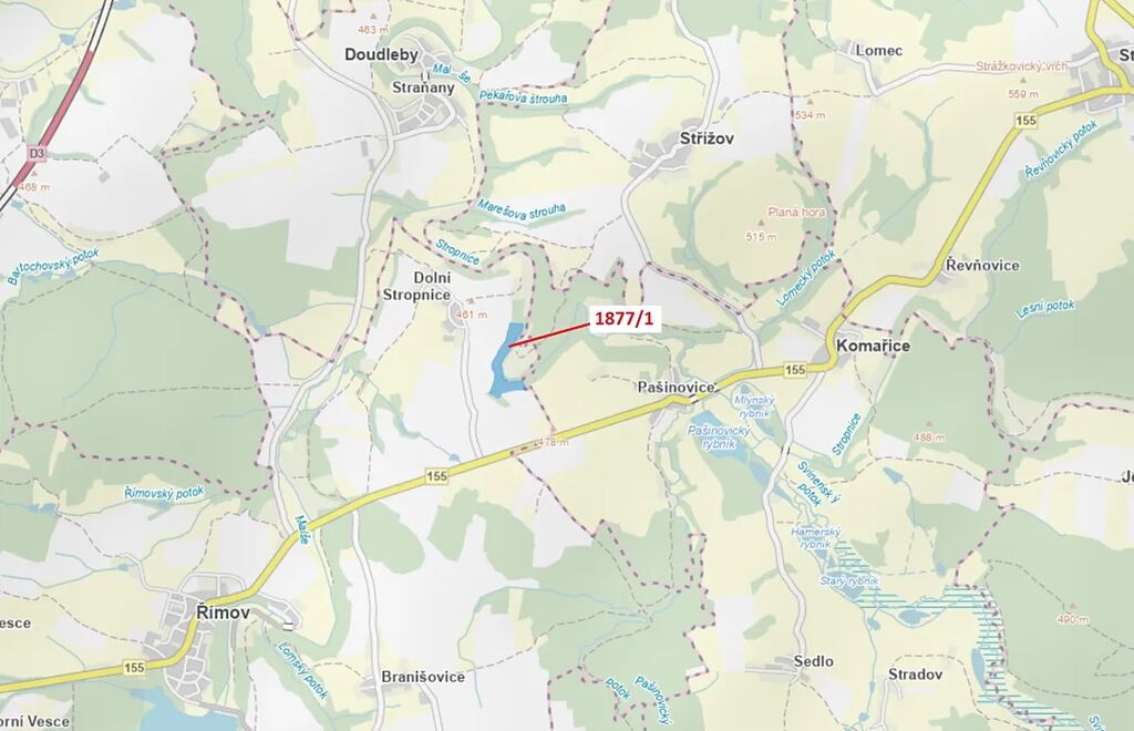 Lesní pozemek o výměře 49 760 m2, parcelní číslo 1877/1, podíl 1/1, katastrální území Dolní Stropnice, obec Římov, obec s rozšířenou působností České Budějovice, okres České Budějovice, Jihočeský kraj.