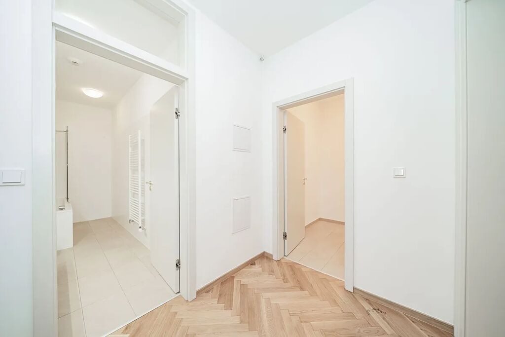 Interiér bytu je nezařízený a dispozice nabízí vstupní předsíň, obývací pokoj s vybaveným kuchyňským koutem, prostornou ložnici, dále koupelnu s vanou a toaletou a velkou komoru s přípojkou na pračku (dle individuální dohody je možné dodat pračku). Kuchyňský kout je vybaven vestavěnými spotřebiči (varná deska, elektrická trouba, myčka, lednice s mrazákem). K bytu náleží sklep.