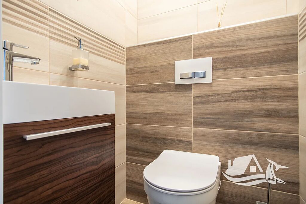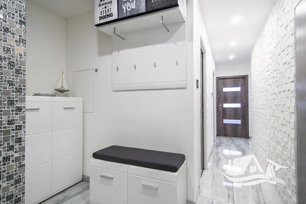Interiér bytu je navržen s citem pro detail a odolnost materiálů, v kuchyni i koupelně najdete luxusní obklady a sanitu, v obývacím pokoji a ložnicích kvalitní vinylovou podlahu, která si zachovává vzhled dřeva a přitom vydrží každodenní provoz.