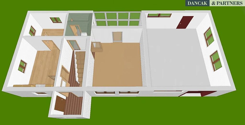 V patře jsou tři pokoje a v šikminách vznikly ještě dvě malé místnosti se střešními okny, které mají různorodé využití.