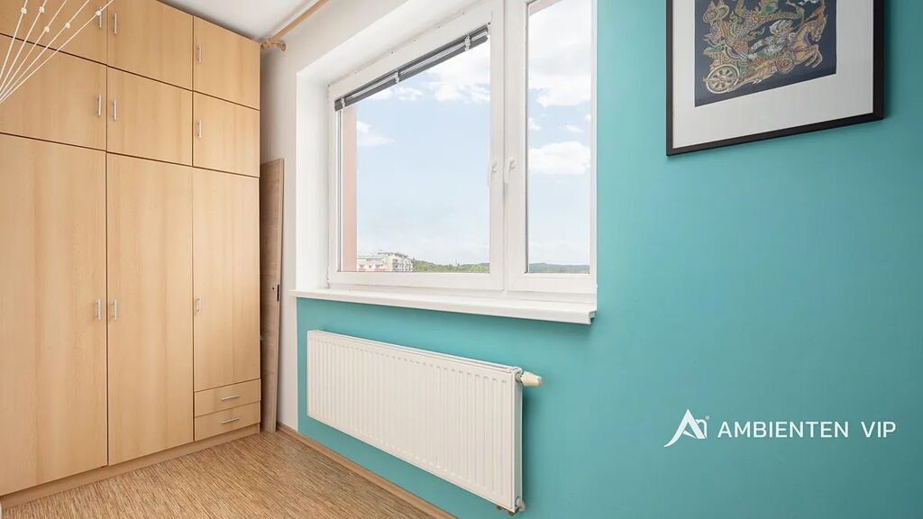 Byt se nachází ve 4. a 5. nadzemním podlaží domu s výtahem a díky orientaci od východu přes jih až po západ je celý den přirozeně osvětlený. Z prostorné terasy i balkonu se otevírají výhledy na žebětínský rybník, přírodní památku Pakárna, farmu U Křivé borovice a okolní Podkomorské lesy. Terasa je řešena kombinací dlažby na terčích a dřevoplastového povrchu, což umožňuje její plnohodnotné využití po celý rok.