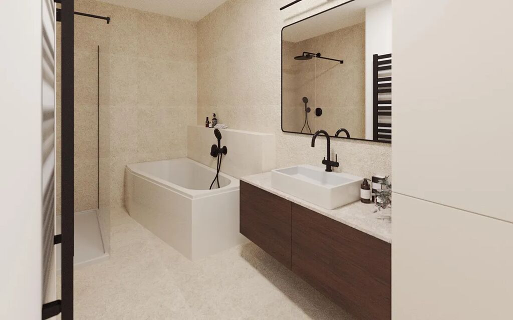 Dispozice bytu je navržena s důrazem na komfort a propojení s přírodou. Dvě ložnice mají přímý vstup na zahradu, což zajišťuje soukromí i klid. Obývací pokoj s kuchyňským koutem nabízí dostatek prostoru pro rodinné chvíle i společenská setkání. Koupelna je vybavena vanou i sprchovým koutem a nechybí ani samostatná technická místnost s praktickým úložným prostorem.