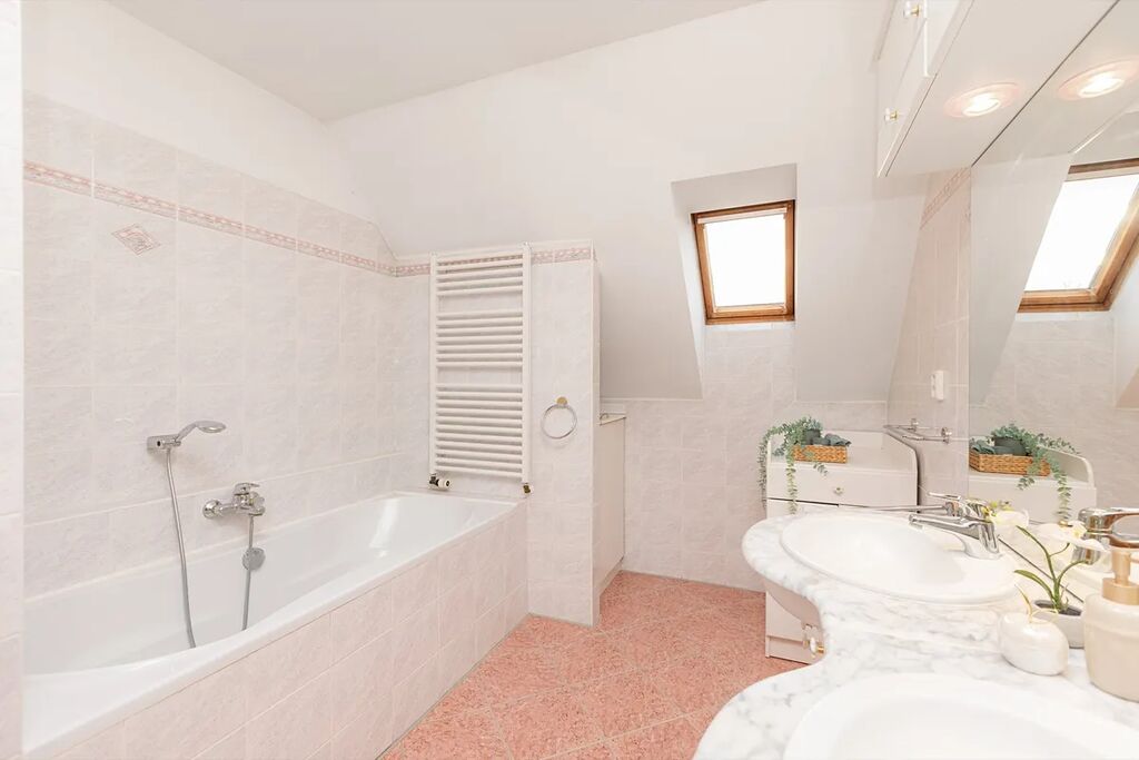 Jeho architektura byla inspirována rakouskými a americkými vlivy, kteří pozorní odhalí i v některých dalších detailech, jako je například shoz na prádlo. Stavba, která z ulice dokonale klame tělem, je opravdu rozlehlá. Včetně garáže ostřeluje metu 450 m2 a nabízí to, co u nových domů naleznete jenom stěží - plnohodnotný suterén, který má i svou obytnou část. Dvě plnohodnotná obytná podlaží, suterén, půda, garáž o ploše skoro 40 m2 a velké ložnice. Perfektní a okamžitě funkční základ pro vaše náročné potřeby, který si v průběhu let můžete doladit přesně podle sebe.