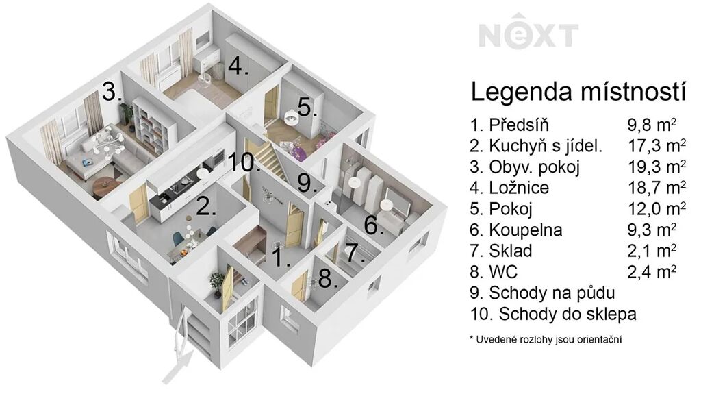 K dispozici je předsíň (9,8 m2), obývací pokoj (19,3m2), kuchyně s jídelnou (17,3 m2), ložnice (18,7 m2), pokoj (12 m2), koupelna (9,3 m2), sklad (2,1 m2), WC (2,4 m2), schody na půdu, schody do sklepa.
