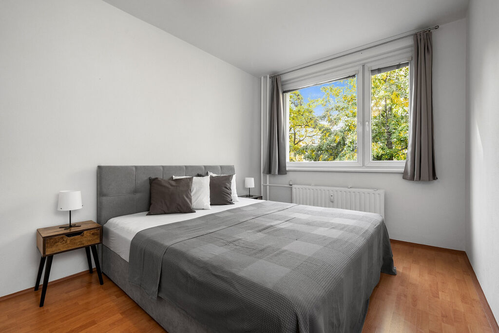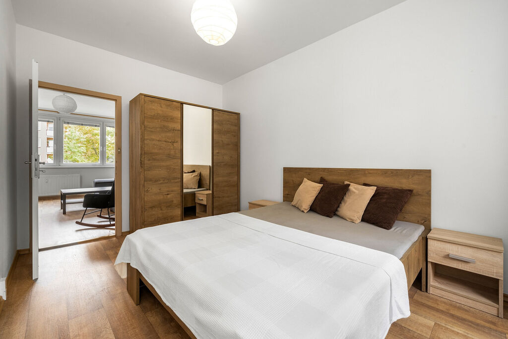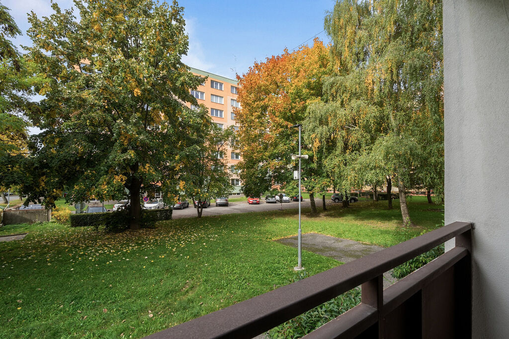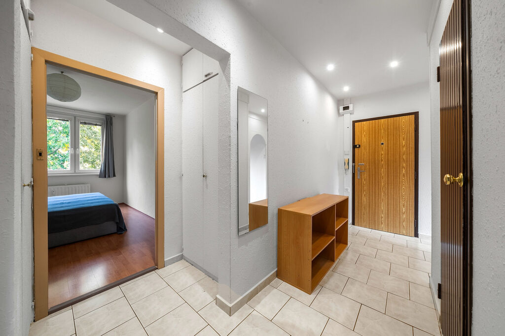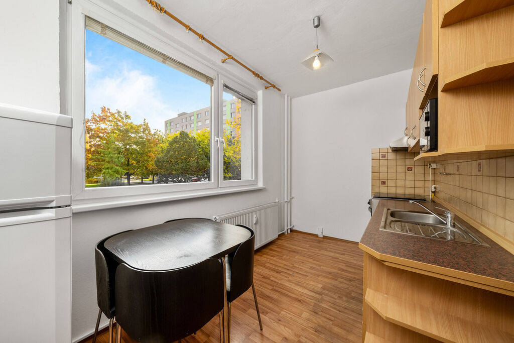 Vstupní chodba bytu nabízí zajímavé úložné prostory. Z chodby je přístup do obývacího pokoje, ze kterého je přístup do jedné z ložnic s lodžií, směřované do zeleně. Dále se z chodby dostanete do druhé ložnice a kuchyně. Koupelna s vanou a oddělená toaleta jsou v původním stavu. Součástí bytu je také sklepní kóje a možnost využít společné sušárny.