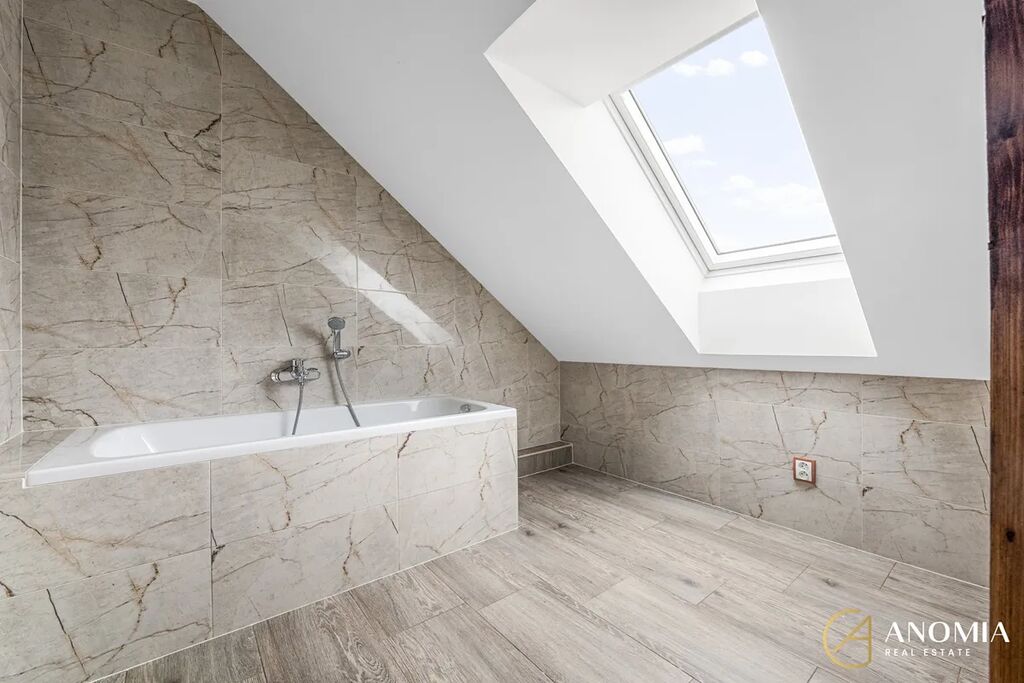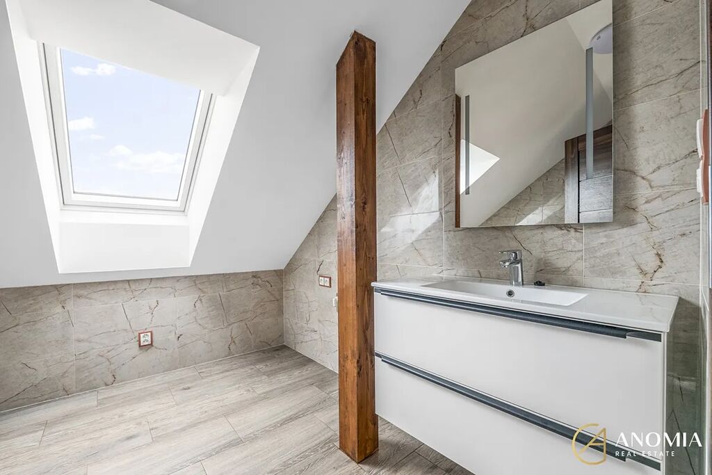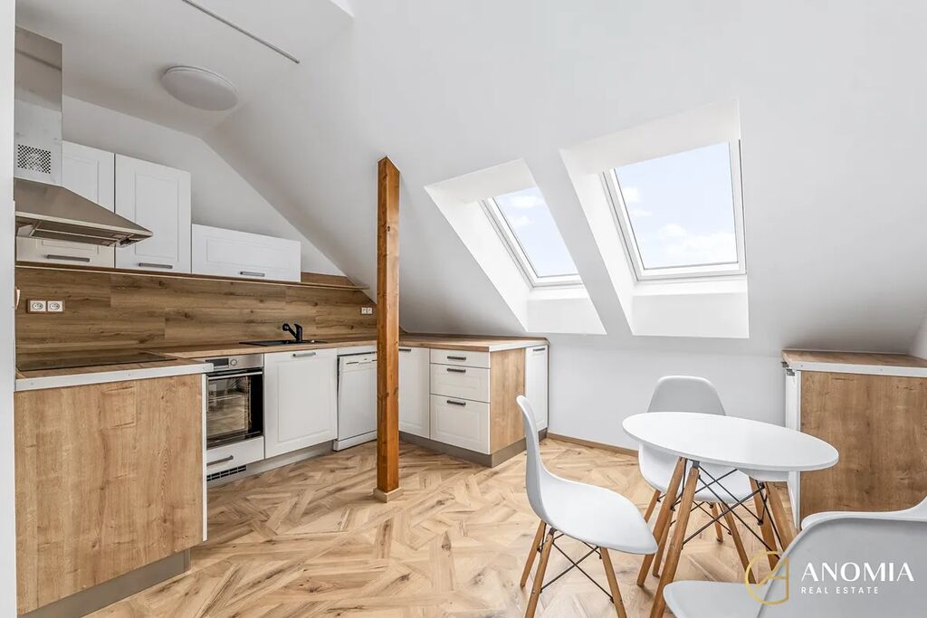 Byt se nachází v cihlovém domě, přístup do jednotky je umožněn samostatným vstupem přímo z ulice. Byt je mezonetový - v přízemí se nachází vstupní hala se šatnou pod schodištěm a vstupem do zahrady. V prvním patře pak najdete obývací pokoj s kuchyňským koutem, dva neprůchozí pokoje, koupelnu s vanou, samostatnou toaletu a technickou místnost s plynovým kondenzačním kotlem. Byt je částečně vybavený - budoucím nájemníkům je v bytě k dispozici kromě kuchyňské linky i jídelní kout a sedací souprava. Byt prošel v posledních měsících citlivou a vkusnou rekonstrukcí. Majitel při rekonstrukci volil kvalitní materiály, využil moderních technologií a zároveň zrenovoval původní odhalené dřevěné trámy, které v celém prostoru umocňují útulnou rodinnou atmosféru. Bytová jednotka je připravena pro vůbec první nájemníky, všechny spotřebiče jsou tedy zcela nové a bez jakéhokoliv opotřebení. K pohodlí v každém ročním období přispívá instalovaná klimatizace.