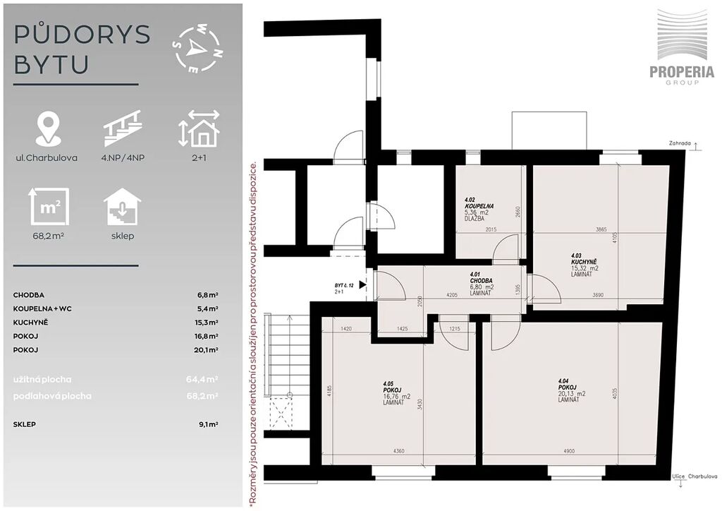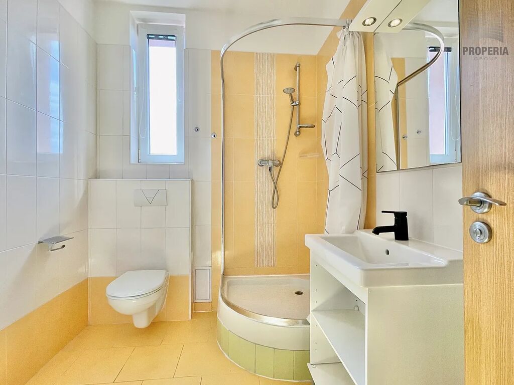 Díky tomu nabízí byt moderní standard a pohodlí, na které se můžete ihned spolehnout. Má praktické dispoziční řešení – centrální chodba zajišťuje samostatné vstupy do kuchyně, koupelny a pokojů orientovaných na východ. K bytu náleží sklep o velikosti 9,1 m².