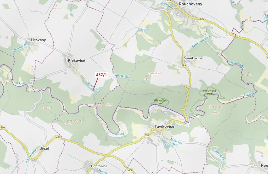 Lesní pozemek o výměře 4115 m2, parcelní číslo 457/1, podíl 1/1, katastrální území Přešovice, obec Přešovice, obec s rozšířenou působností Třebíč, okres Třebíč, Kraj Vysočina. Po těžbě.