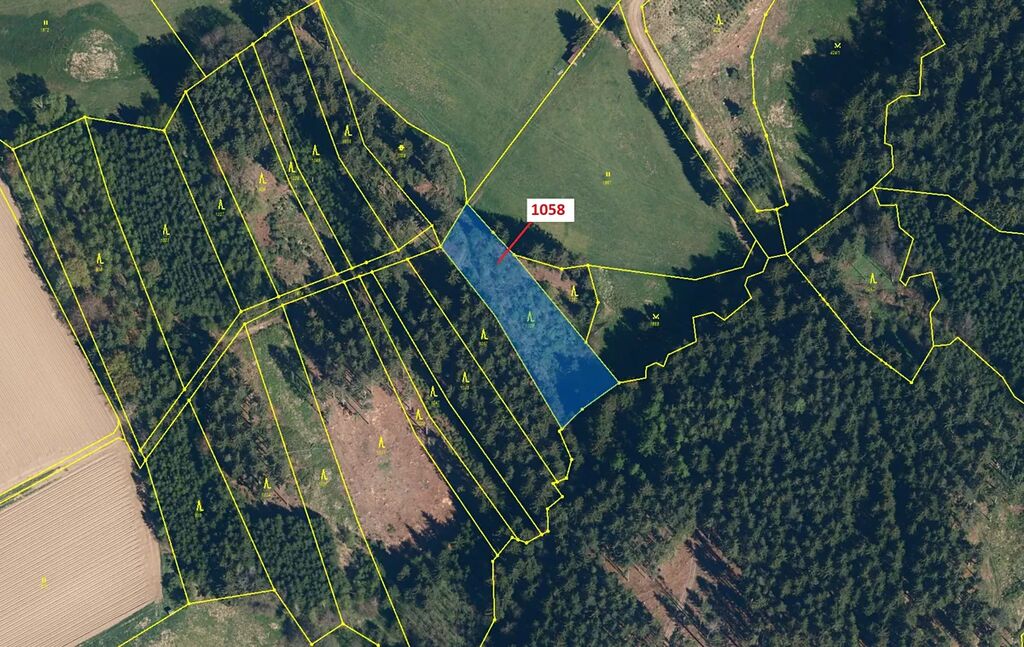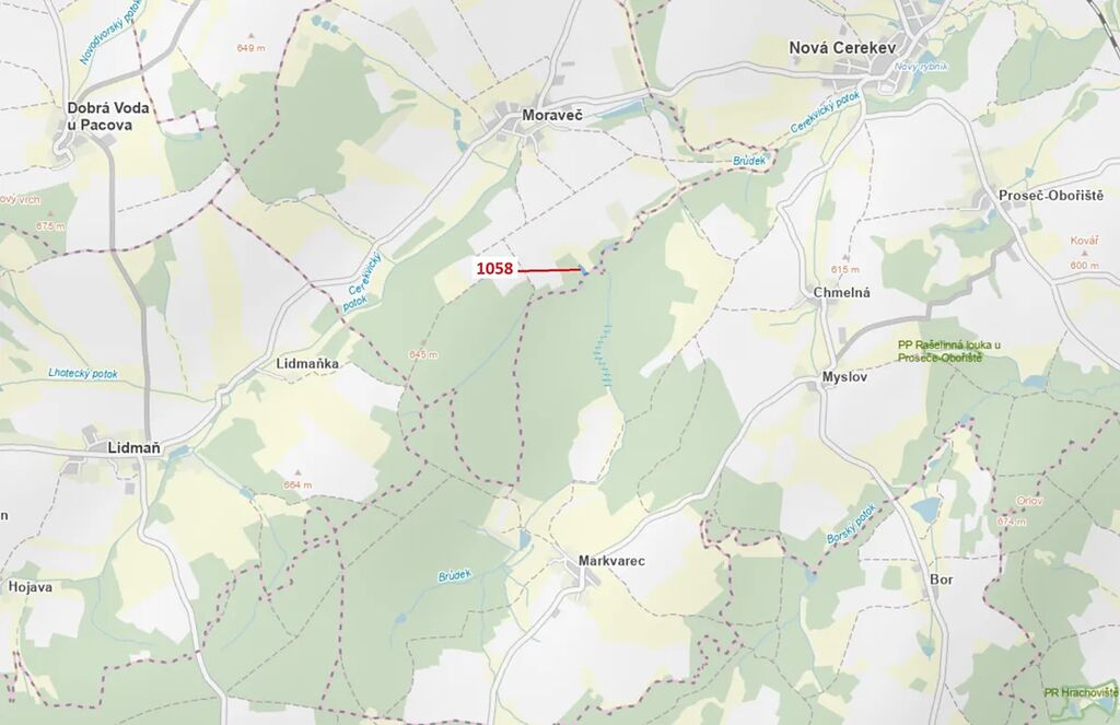Lesní pozemek o výměře 2350 m2, parcelní číslo 1058, podíl 1/1, katastrální území Moraveč, obec Moraveč, obec s rozšířenou působností Pelhřimov, okres Pelhřimov, Kraj Vysočina. Po těžbě.