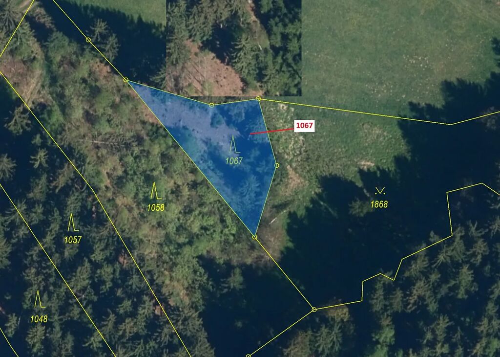 Lesní pozemek o výměře 543 m2, parcelní číslo 1067, podíl 1/1, katastrální území Moraveč, obec Moraveč, obec s rozšířenou působností Pelhřimov, okres Pelhřimov, Kraj Vysočina. Po těžbě.