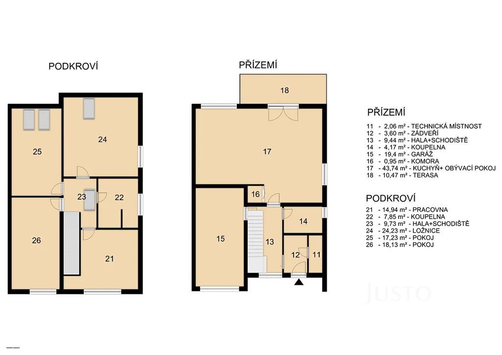 • Dvě koupelny, jedna v přízemí, druhá v obytném podkroví