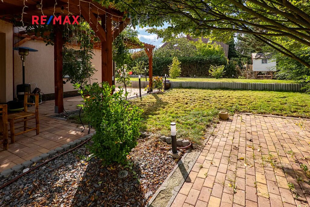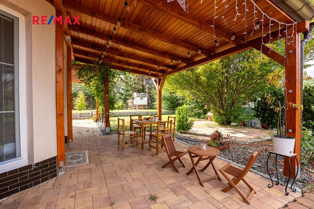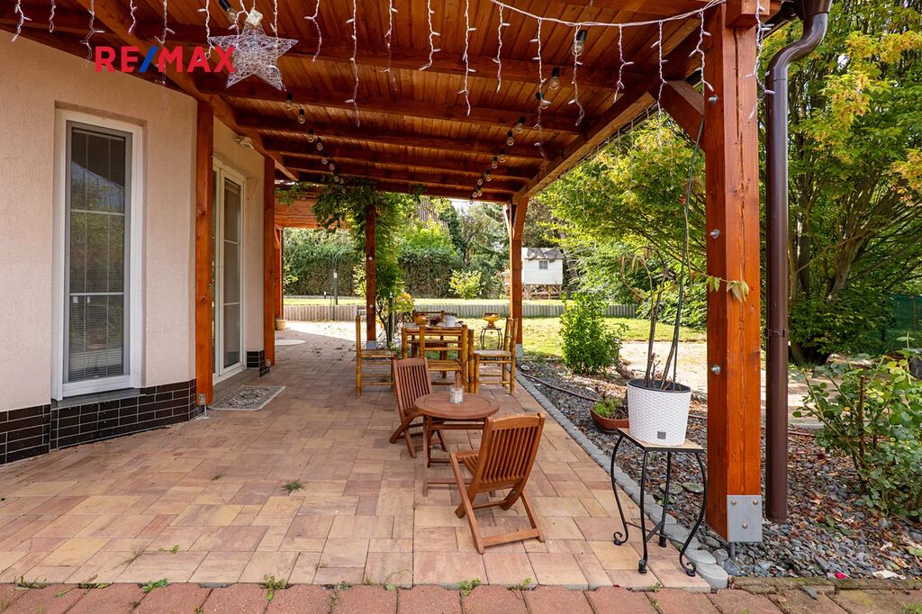 Zahrada s krytou terasou ideální pro rodinné posezení. Součástí je prostor pro bazén a místo pro dětské hry.