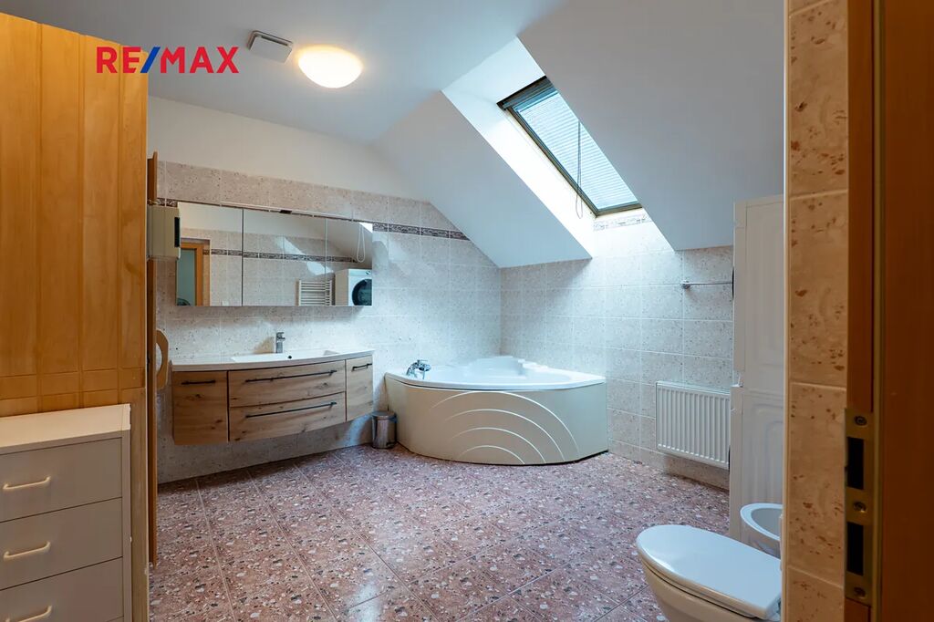 V patře je koupelna se saunou, rohovou vanou i sprchovým koutem a finskou saunou. Nachází se zde také pračka a sušička. Celková plocha koupelny je 17,48 m².
