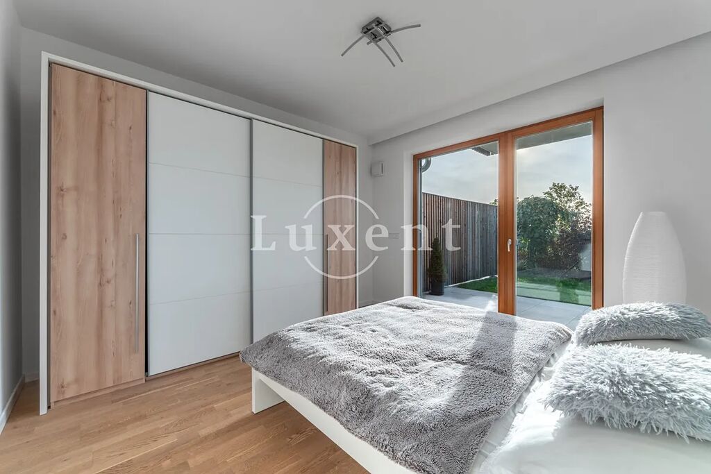 Byt je situován v 1.NP, interiér zahrnuje předsíň, velkorysý vzdušný obývací pokoj s kuchyní, ložnici, prostornou koupelnu s vanou, toaletou a komoru, kde je prostor pro pračku. Oba pokoje májí přímý vstup na předzahrádku, pro příjemné posezení, ale také propojení s přírodou a výhledy do atmosferické zahrady se vzrostlou zelení a jezírkem.