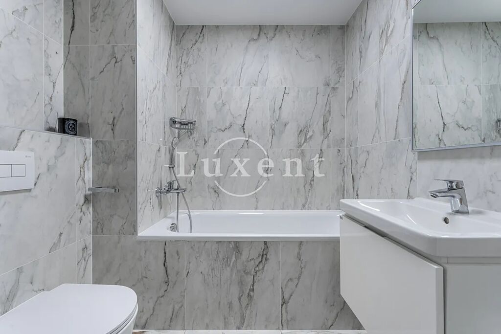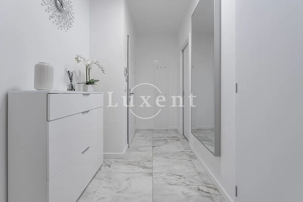 Byt má jednotný minimalistický a nadčasový design. V nemovitosti jsou použity kvalitní materiály, podlahové vytápění, rekuperace, velkoformátová dřevěná okna s trojskly a předokenními žaluziemi. V obývacím pokoji je umístěna klimatizační jednotka. Podlahová krytina byla zvolena v kombinaci dlažby a plovoucí dřevěné podlahy, která je v ložnici.