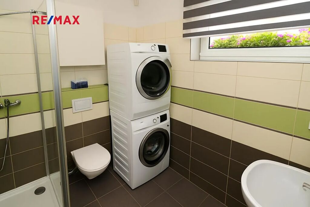 V přízemí této nemovitosti je dále koupelna s nadstandardně velkým sprchovým koutem, WC a prostorem pro pračku a sušičku. Dále pak technická místnost.
