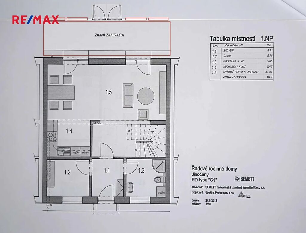 Dominantou tohoto domu je obývací pokoj s kuchyňským koutem vybaveným veškerými vestavěnými spotřebiči a vstupem do již zmiňované zimní zahrady a dále na zahrádku.