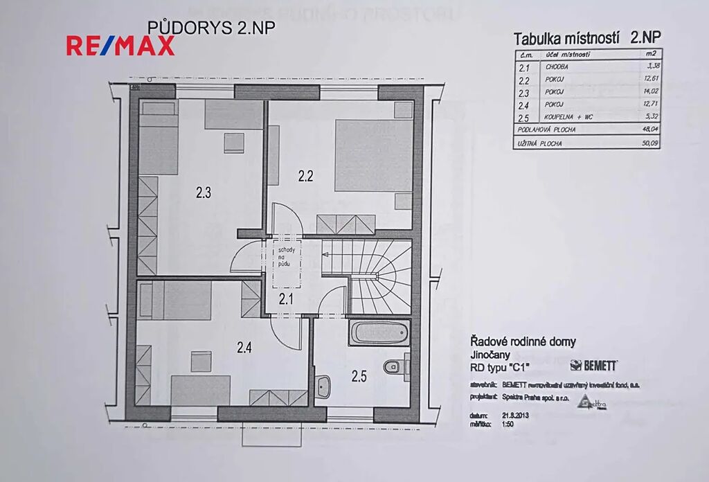 V prvním patře pak nalezneme 3 samostatné ložnice a druhou koupelnu s WC a vanou.