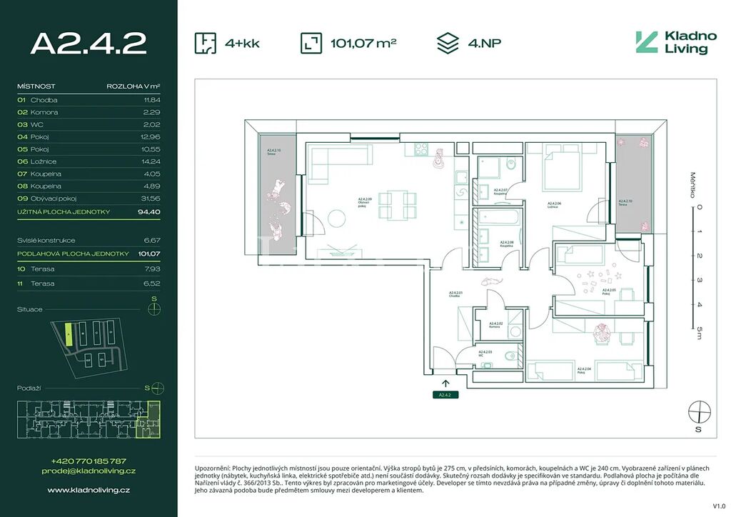 Nabízíme ke koupi moderní byt 4+kk o podlahové ploše 101 m² se dvěma terasami 7,9 a 6,5 m² v rezidenčním projektu Kladno Living, který vzniká v jedné z nejatraktivnějších lokalit města Kladno – Kročehlavy. Tento nový developerský projekt představuje jedinečnou příležitost pro ty, kteří hledají nové byty v Kladně nebo investici do nemovitosti s vysokým potenciálem zhodnocení.