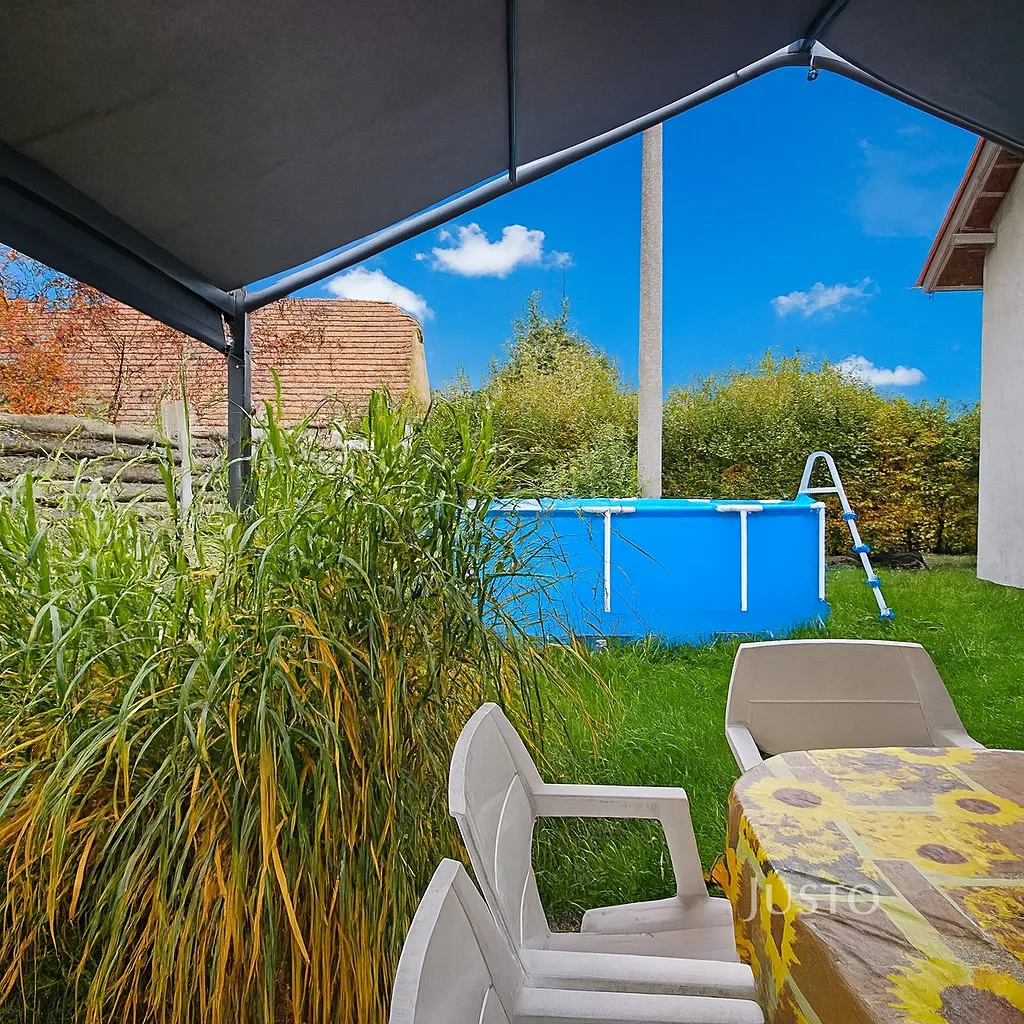 Na udržované zahradě je nadzemní bazén a několik okrasných dřevin. Celkově působí dům velmi útulně a klidně – ideální prostředí pro rodinnou rekreaci nebo pohodové trvalé bydlení. V posledních letech využíval majitel dům ke krátkodobým, rekreačním pronájmům. V případě zájmu je možné stejné využití.