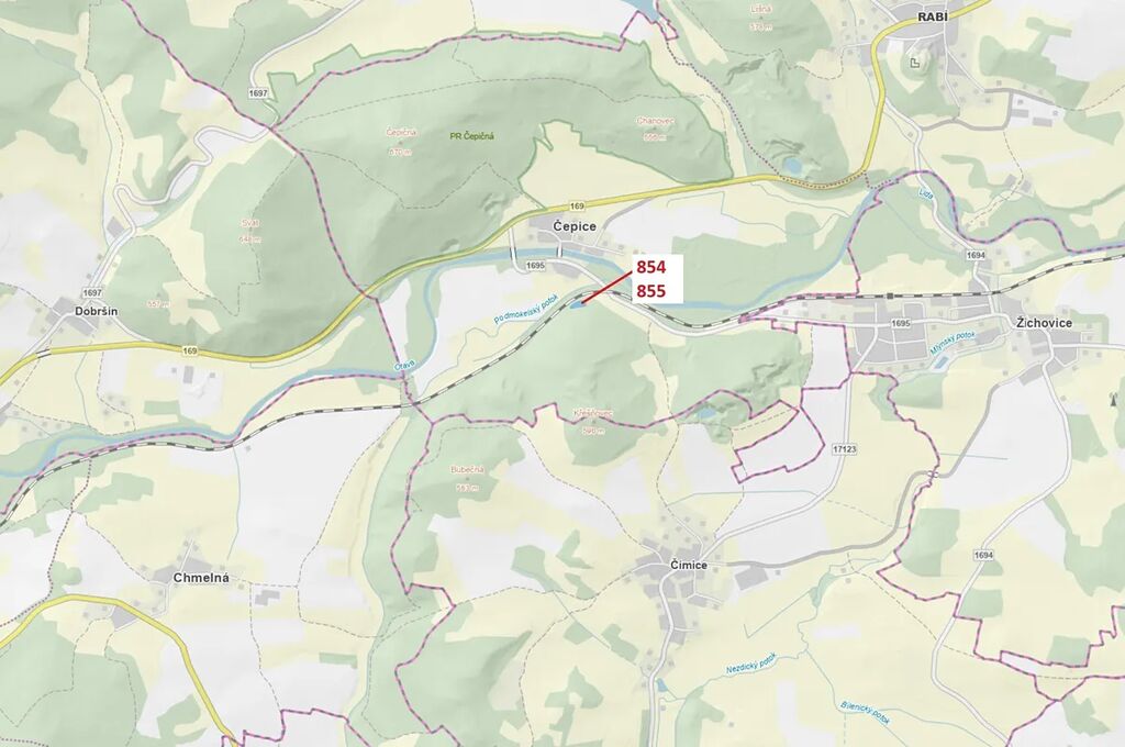 Lesní pozemky o výměře 2 561 m2, parcelní čísla 854, 855, podíl 1/1, katastrální území Čepice, obec Rabí, obec s rozšířenou působností Sušice, okres Klatovy, Plzeňský kraj. Po těžbě.