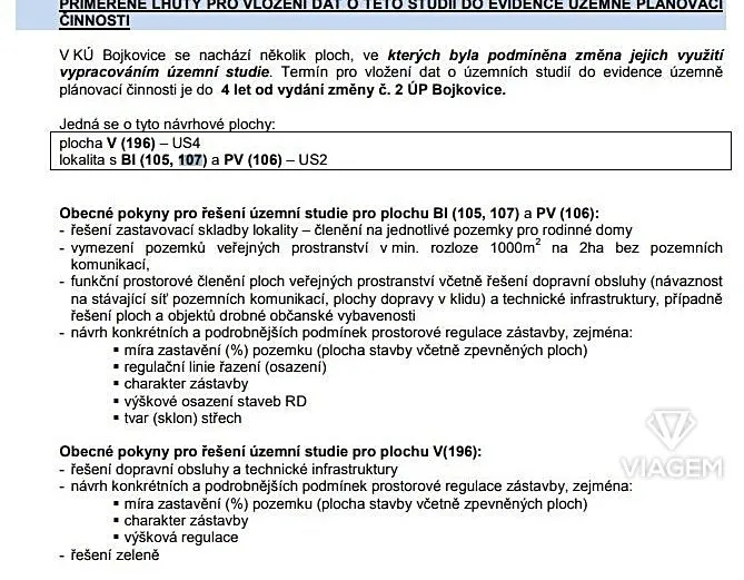 Pozemek je vedený v územním plánu obce jako stavební plocha BI 2007. Bydlení individuální rodinné domy. Pro dané území je vypracována územní studie s konkrétním návrhem využití území. V plánu je vybudování přístupových komunikací a inženýrských sítí (elektro, vodovodu a kanalizace). Kapacity stávajících sítí jsou dostatečné, přípojné body jsou v řešitelné vzdálenosti. Pozemky tvoří jednotný územní a funkční celek a jsou rovinaté a přístupné z obecních komunikací. Na požádání Vám sdělíme další informace o možnostech využití.