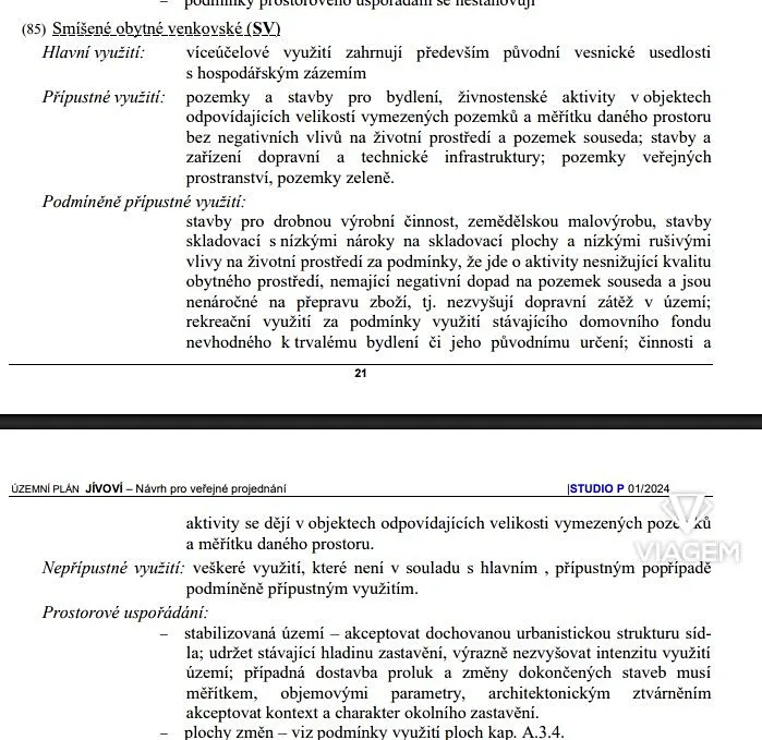 Pozemky jsou dle platného územního plánu vedeny jako plochy smíšené obytné venkovské (SV) – tedy stavební s možností výstavby rodinných domů, rekreačních objektů či menších provozoven. Tím se otevírá zajímavá příležitost pro investici v rozvíjející se lokalitě s venkovským charakterem.