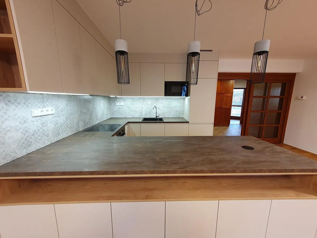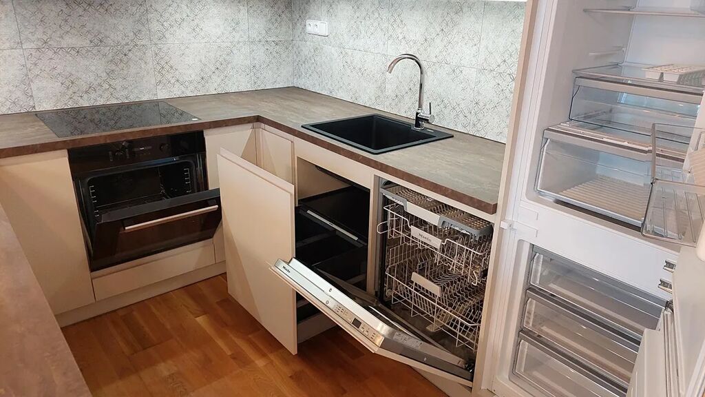 obývací pokoj s plně vybavenou novou moderní kuchyňskou linkou s myčkou a lednicí s mrazákem,