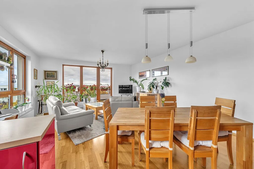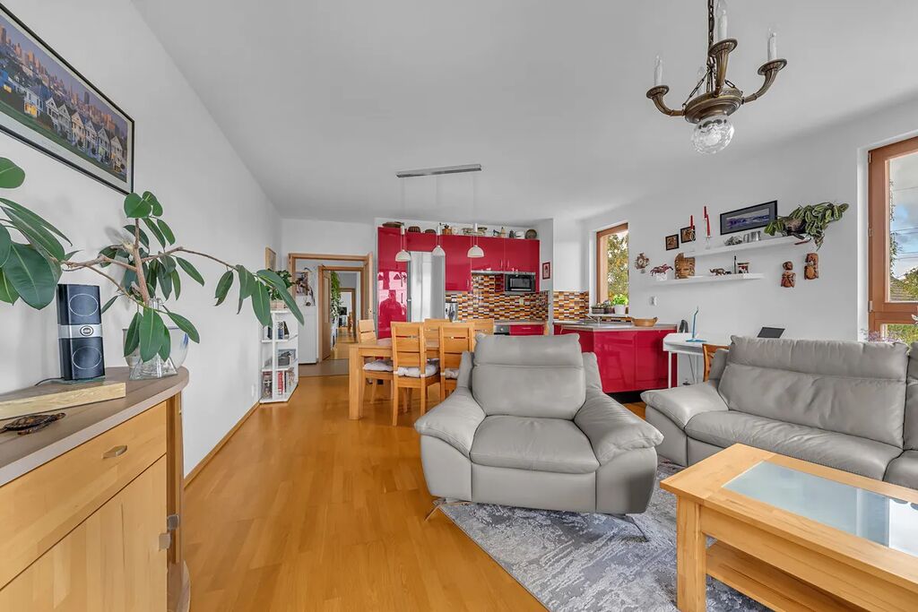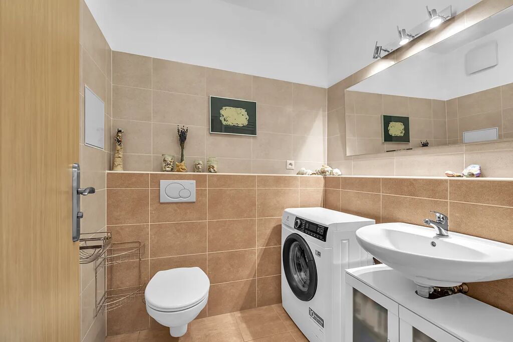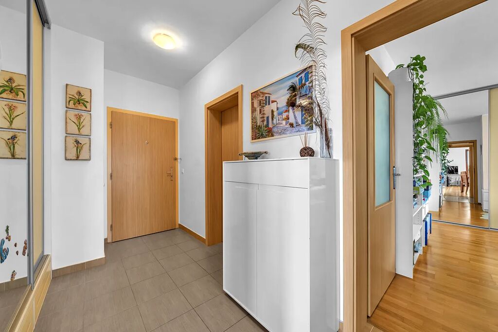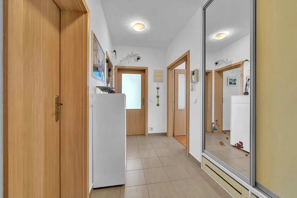 Interiér bytu je navržen v minimalistickém stylu s důrazem na světlo, prostor a funkčnost. Obývací pokoj s kuchyňským koutem je propojen s balkonem, který nabízí příjemné posezení s výhledem do zeleně i na město. Kuchyně je vybavena moderními vestavěnými spotřebiči a výrazným barevným obkladem. Ložnice i další pokoj jsou světlé, s dostatkem úložného prostoru. V bytě se nachází dvě koupelny – jedna s vanou, druhá se sprchovým koutem, což výrazně zvyšuje komfort pro rodinu i návštěvy. V předsíni se nachází vestavěné skříně a zrcadlové dveře, které opticky zvětšují prostor.