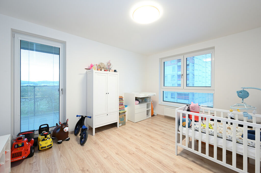 Dominantou bytu je prostorný obývací pokoj s kuchyňským koutem o výměře 34,7 m², který tvoří srdce celého bytu. Z obývacího pokoje je přímý vstup na terasu o velikosti 22,3 m², která svou rozlohou patří mezi nadstandardní a poskytuje ideální prostor pro venkovní posezení, odpočinek či pěstování bylinek, rajčat a dalších rostlin. Z obývacího pokoje je zároveň přístup i do jedné z ložnic o velikosti 16,5 m², ze které je možné na terasu vstoupit také. Druhá ložnice má 19 m² a nabízí dostatek prostoru pro manželskou postel s pracovním koutem nebo vše potřebné pro dvě děti.