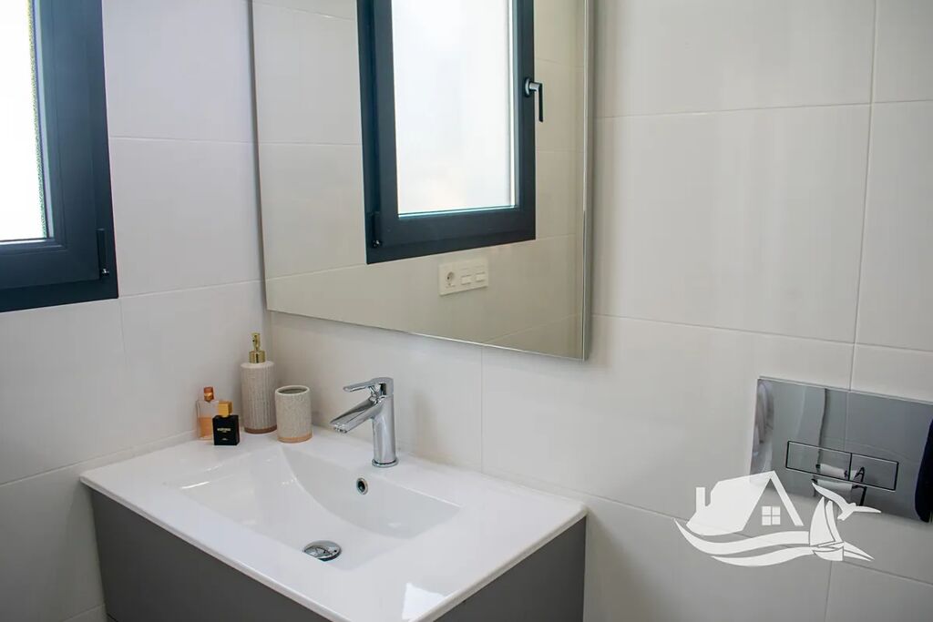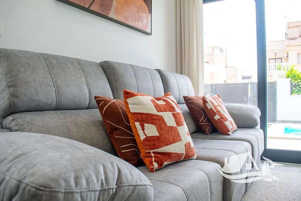 Exteriér je kompletně vydlážděný pro minimální údržbu a nabízí soukromý bazén – ideální místo k relaxaci, opalování nebo večernímu posezení s přáteli. Dům je prodáván plně zařízený, připravený k okamžitému nastěhování, což z něj dělá jedinečnou příležitost pro ty, kteří hledají prakticky novou nemovitost na Costa Blance bez starostí s vybavováním.