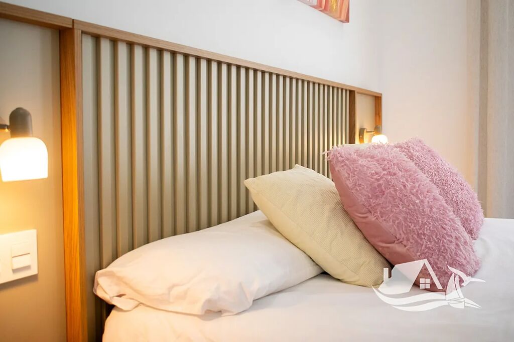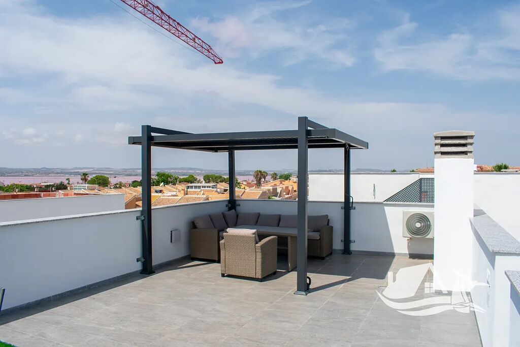 Vila stojí na pozemku o velikosti 116 m² a má obytnou plochu 106 m² rozloženou do dvou podlaží. V přízemí se nachází světlý obývací pokoj s jídelnou a otevřenou kuchyní, dvoulůžková ložnice a kompletně vybavená koupelna, což umožňuje pohodlné bydlení i bez nutnosti používání schodů. V horním patře jsou dvě prostorné ložnice s vlastními koupelnami a přímým vstupem na soukromé solárium, odkud se otevírá okouzlující výhled na slavné růžové jezero Laguna Rosa v Torrevieji.