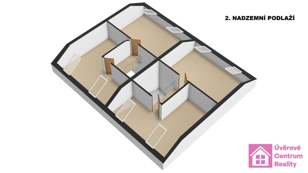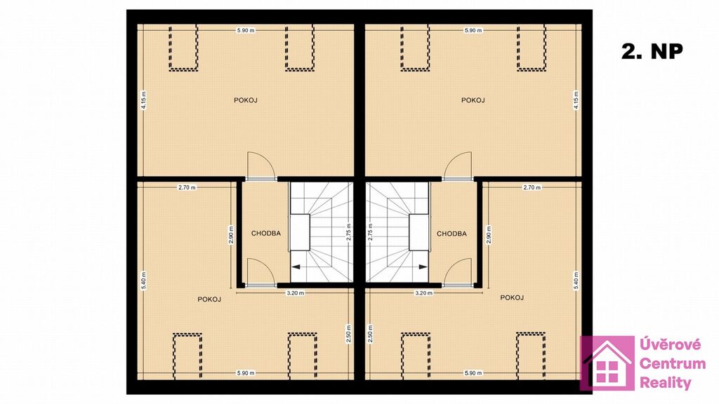 2.nadzemní podlaží: schodiště, chodba a dva pokoje (oba byty)