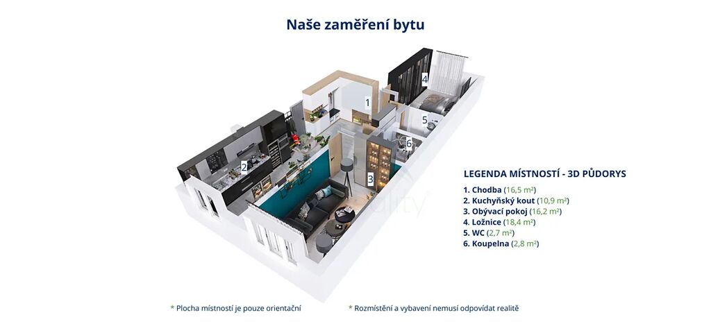 Jsme v 1. nadzemním podlaží z celkových 6. NP cihlového domu a to v bezpečné výšce 2 m nad zemí. Byt se skládá z chodby (16,50 m²), ze které se dostaneme do každé místnosti včetně kuchyně (10,90 m²). Chodba se dá předělat na obývací pokoj a vznikneme Vám tak byt o dispozici 3+kk, přičemž obývací pokoj+kk budou mít 27,5 m². Dále jsou tu 2 ložnice, koupelna se sprchovým koutem a samostatné WC.