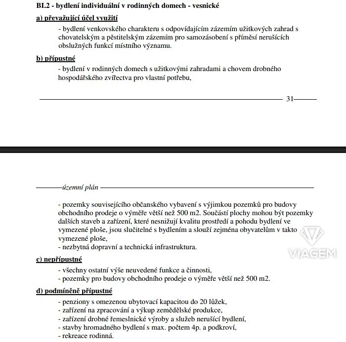 Pozemky jsou dle územního plánu určeny k výstavbě rodinných domů venkovského typu. Povolena je také drobná podnikatelská činnost nebo rekreační využití, vše v souladu s klidným charakterem lokality.