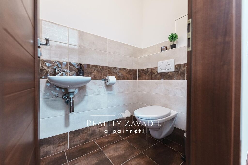 V koupelně najdete rohovou vanu, umyvadlo a pračku. Toaleta je samostatně.
