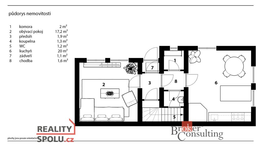 Přízemí: kuchyně, obývací pokoj, koupelna, WC, komora, vstupní chodba