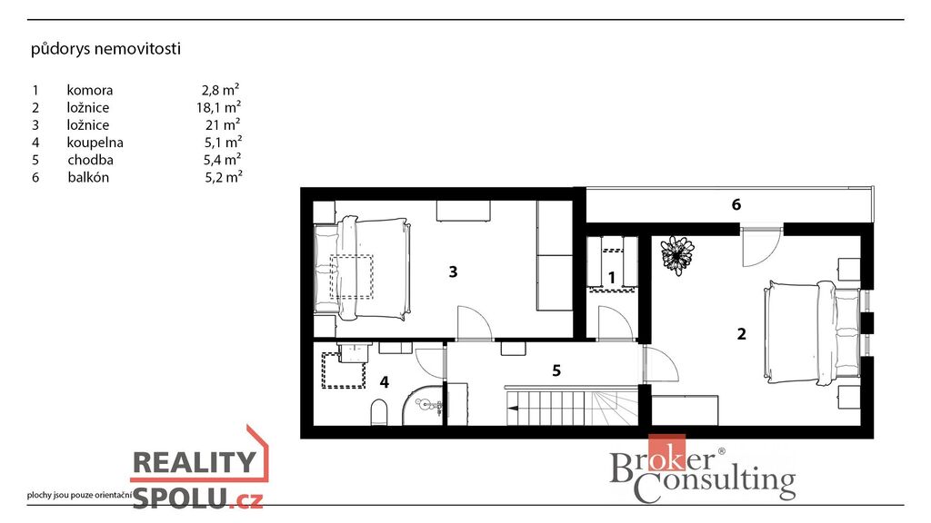 Podkroví: dvě ložnice, koupelna, komora, balkon