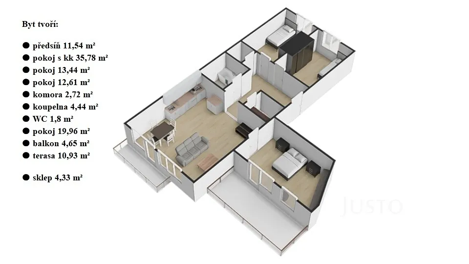 Hned po otevření dveří Vás přivítá světlý a vzdušný interiér s moderními podlahami a velkými okny, která propouští dostatek denního světla do všech místností. Byt má tři neprůchozí ložnice – ideální řešení pro rodiče i děti, které se tak mohou těšit na svůj bezpečný prostor. Obývací pokoj propojený s kuchyňským koutem (kuchyňská linka není součástí a můžete si ji navrhnout dle svých představ, přičemž pro inspiraci máme připravenu vizualizaci i rozpočet) je srdcem domácnosti, ze kterého můžete vstoupit přímo na rozlehlou terasu o ploše téměř 11 m². Tato terasa navíc nabízí dostatek místa pro rodinné snídaně, letní grilování nebo večerní posezení. Další bonus představuje útulný balkon orientovaný na jih, odkud můžete pozorovat krásy okolní zeleně.